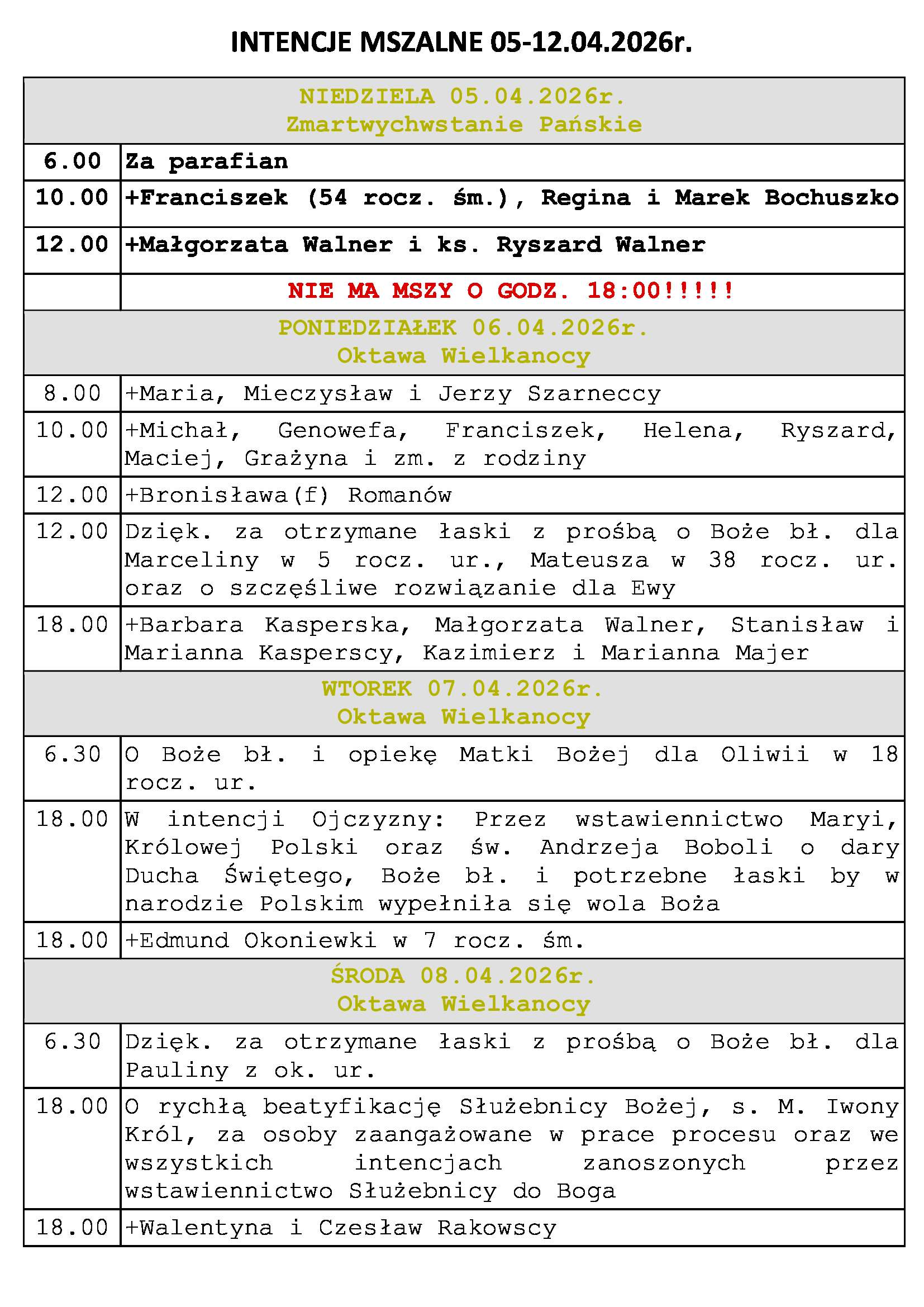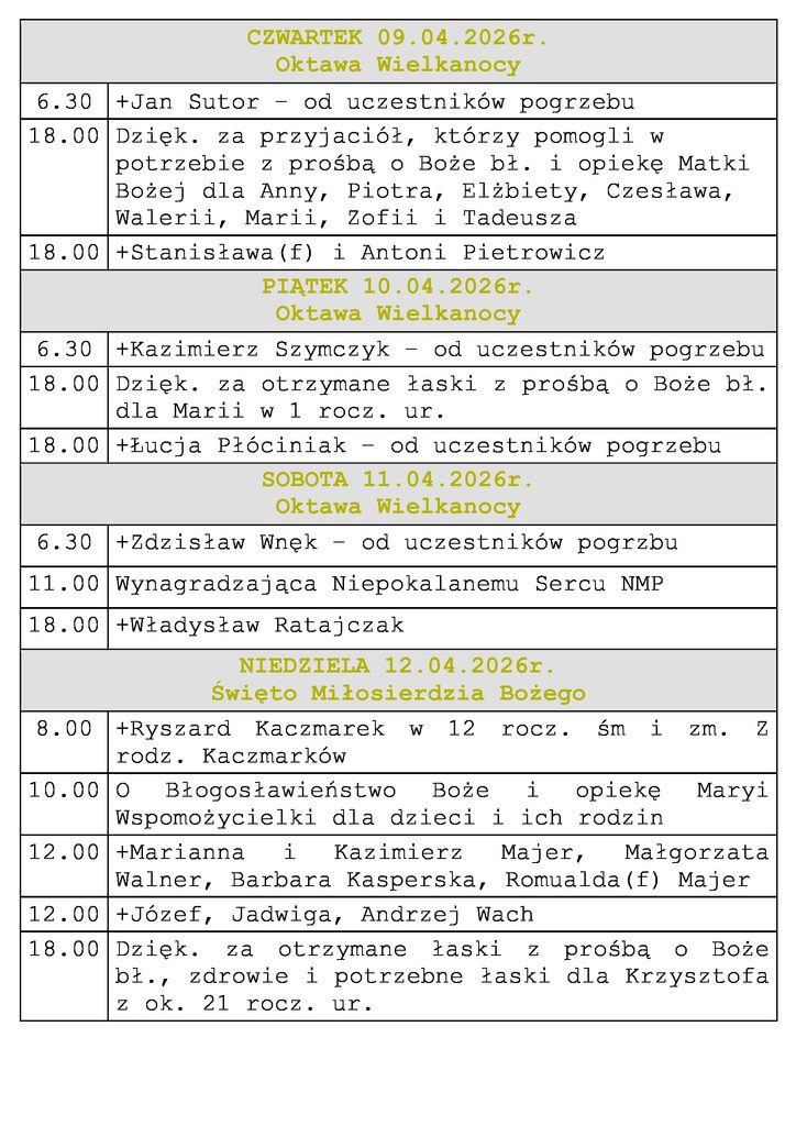 Intencje Mszalne 05-12.04.2026r.
