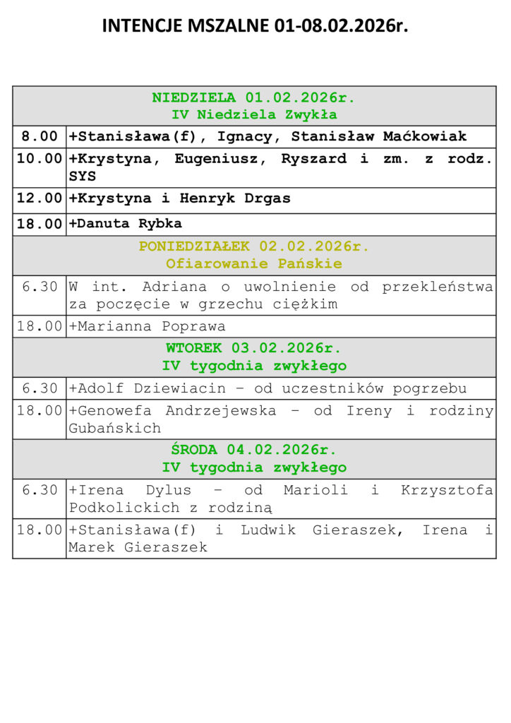 Intencje Mszalne 01-08.02.2026r.