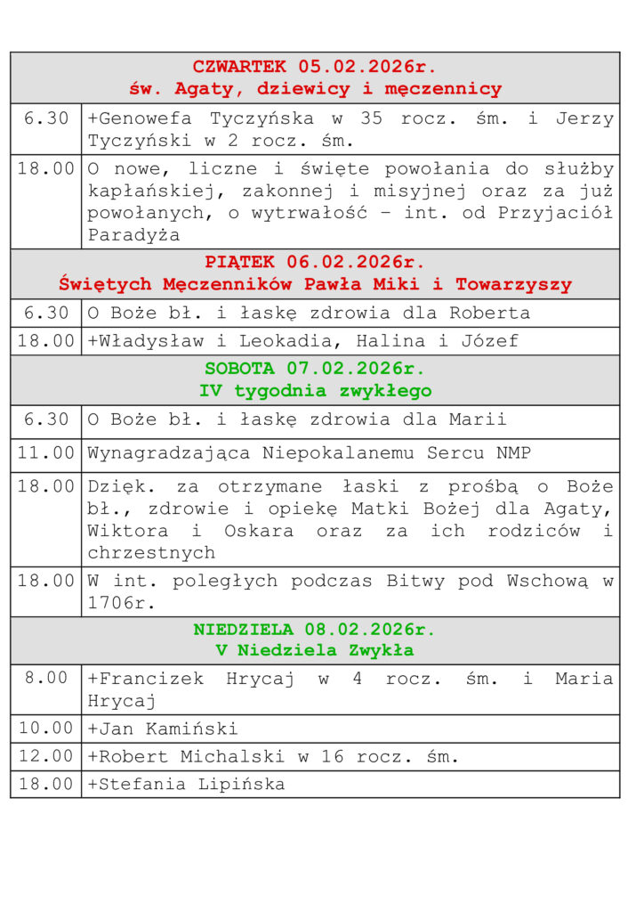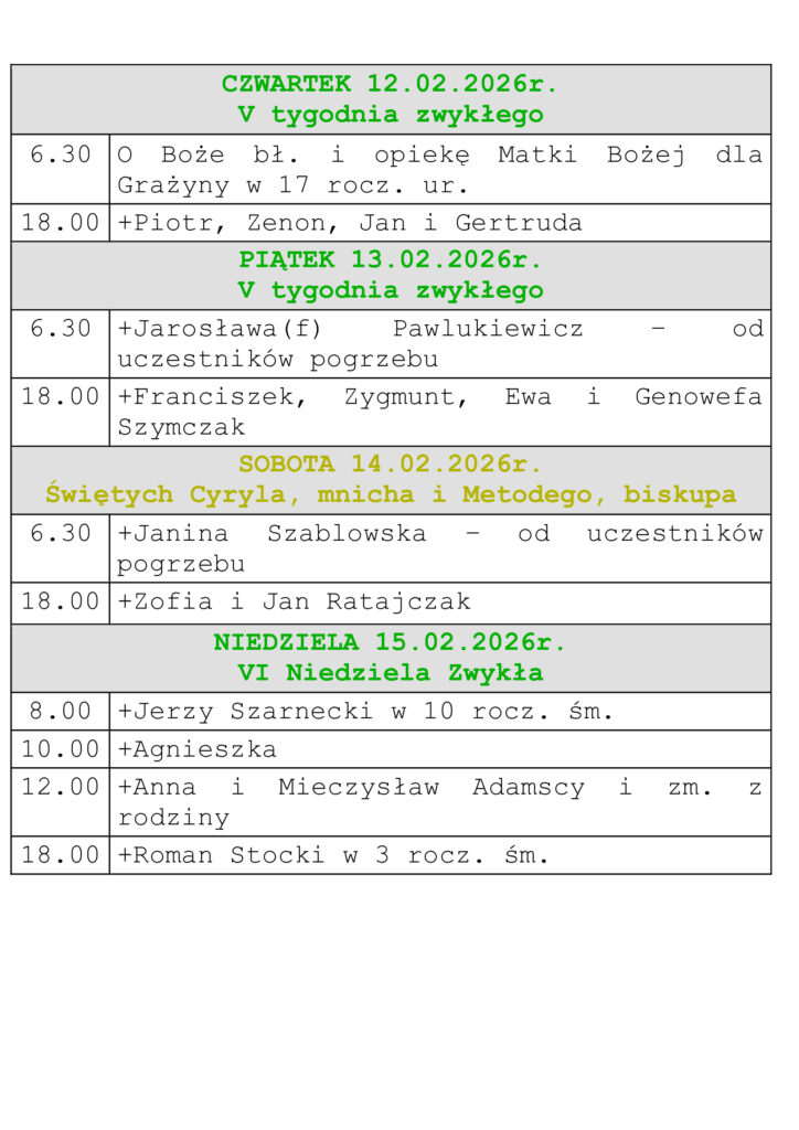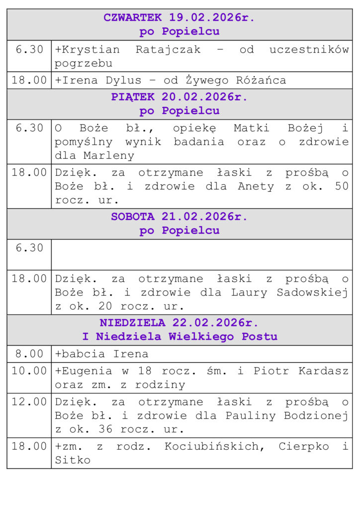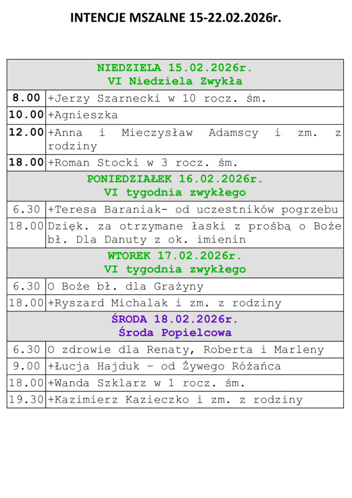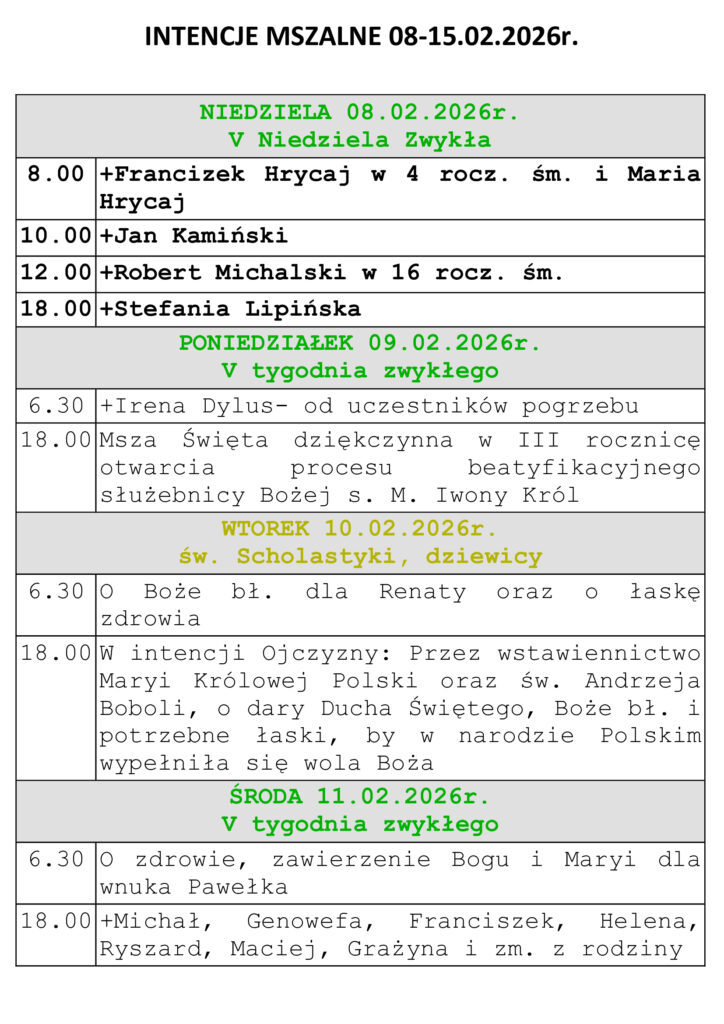 Intencje Mszalne 08-15.02.2026r.