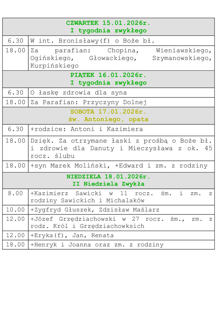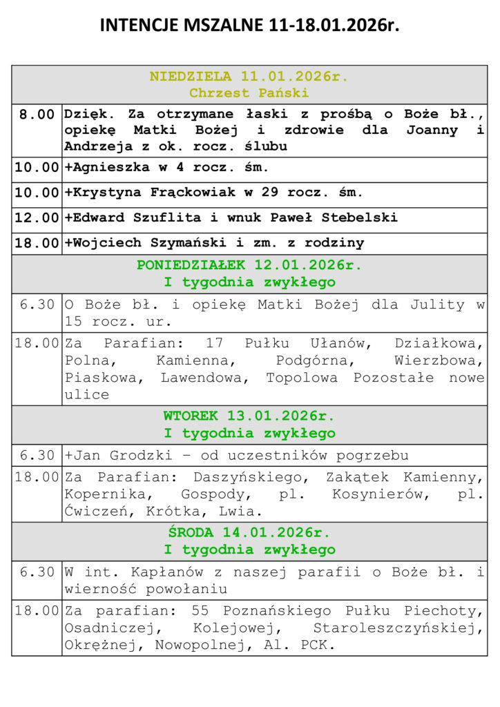 Intencje Mszalne 11-18.01.2026r.