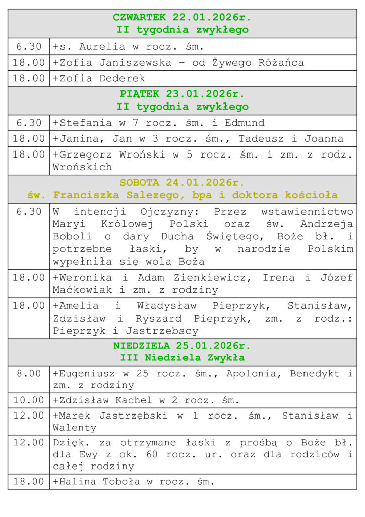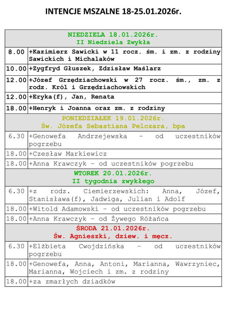 Intencje Mszalne 18-25.01.2026r.