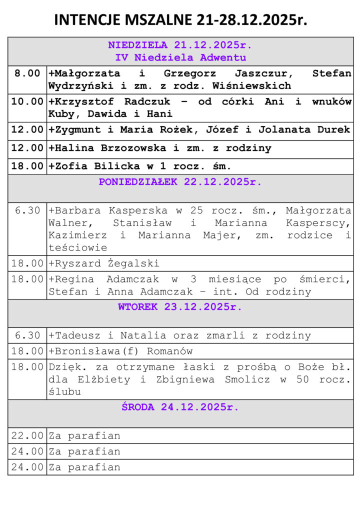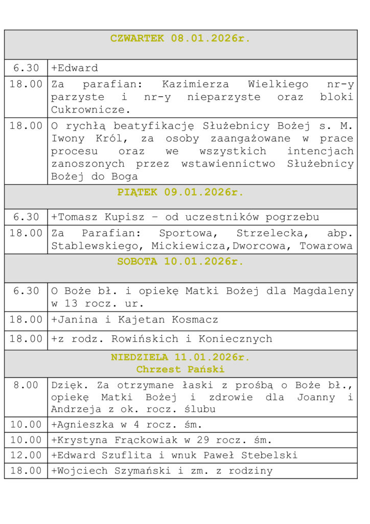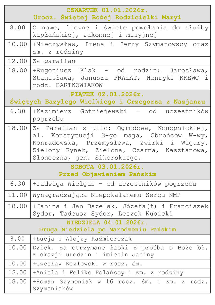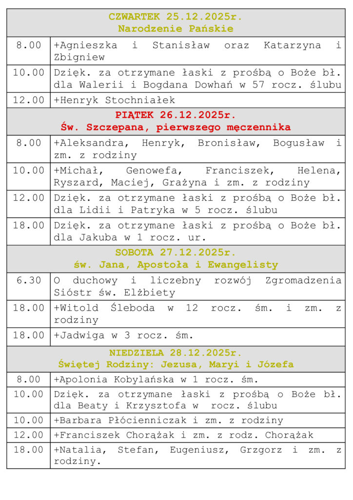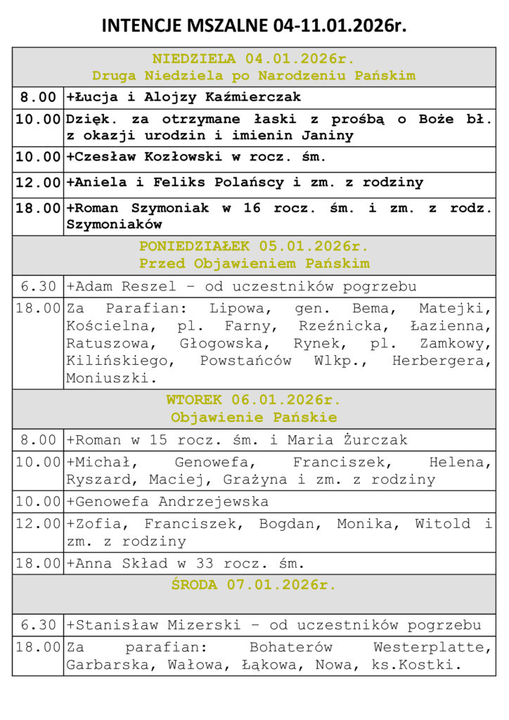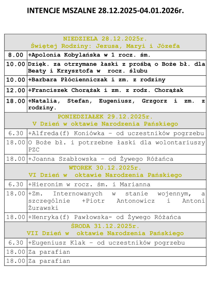 Intencje Mszalne 28.12.2025r. – 04.01.2026r.