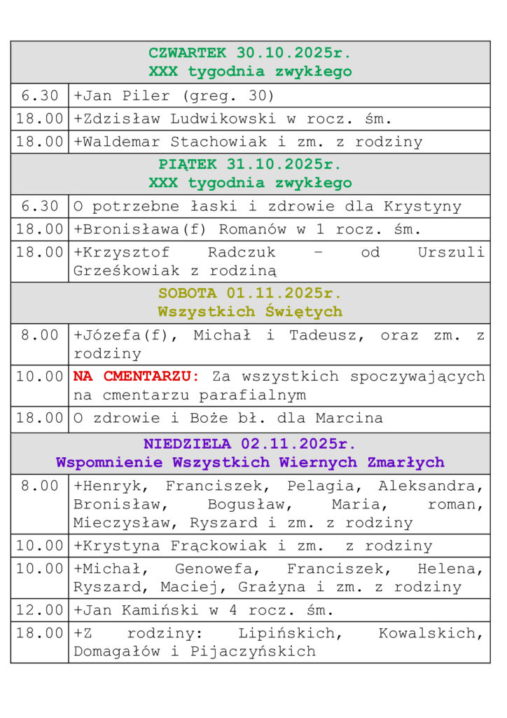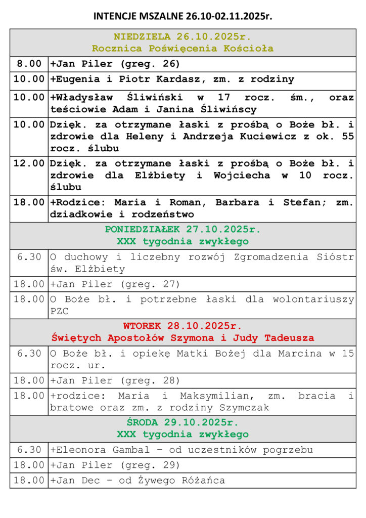 Intencje mszalne 26.10.-02.11.2025r.