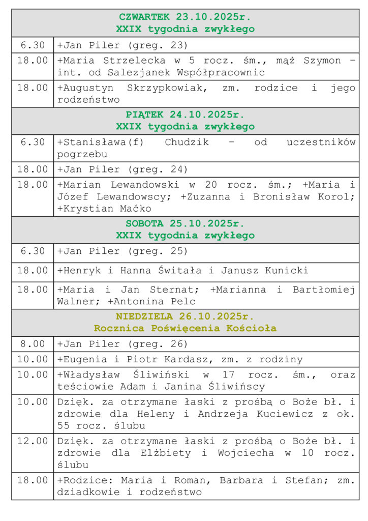 Intencje Mszalne 19-26.10.2025r.