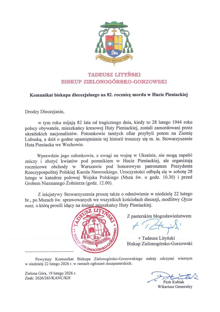 Komunikat biskupa diecezjalnego na 82. rocznicę mordu w Hucie Pieniackiej.