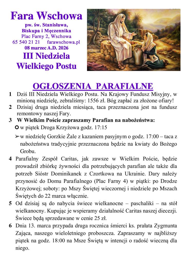 Dziś I Niedziela Wielkiego Postu. Pamiętajmy o podejmowaniu, w tym szczególnym czasie, postanowień, które pomogą nam dobrze przygotować się do świąt Paschalnych. W ubiegłą niedzielę zebraliśmy: 2842,20 zł. do puszek na pomoc Ukrainie. Bóg zapłać za złożone ofiary.