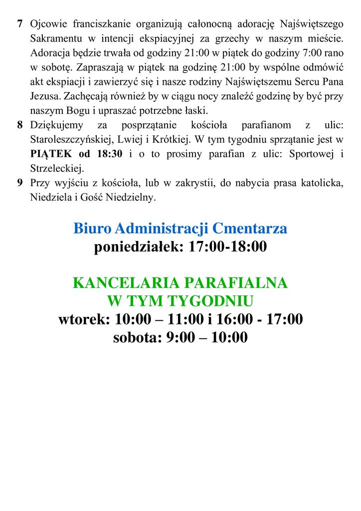 Dziękujemy za posprzątanie kościoła parafianom z ulic: Kurpińskiego i Głowackiego. W tym tygodniu sprzątanie jest w PIĄTEK o 18:30 i o to prosimy parafian z ulic: al. PCK, Kolejowej i Towarowej.